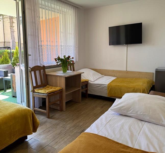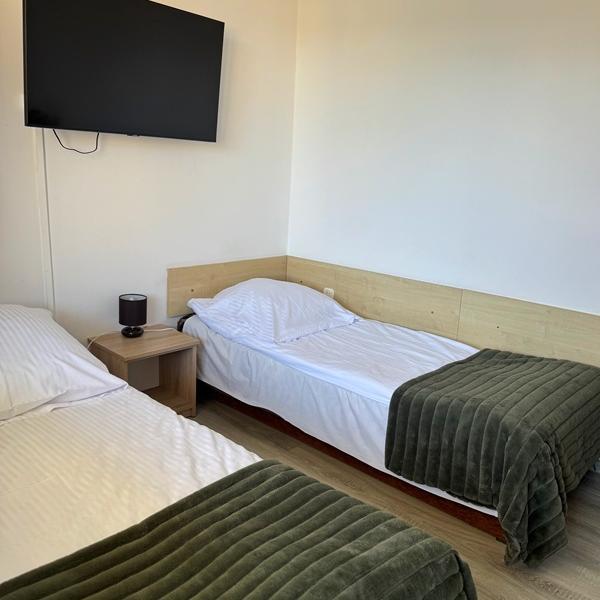 Proponujemy Państwu kameralny wypoczynek w pokojach 3-osobowych wyposażonych w trzy pojedyncze łóżka z możliwością łączenia na życzenie gości. W części z nich znajdują się łazienki z pełnym węzłem sanitarnym, a pozostałe kwatery mają łazienki wspólne. Wszystkie pokoje wyposażone są w lodówkę i czajnik elektryczny oraz telewizor. Do Waszej dyspozycji są również w pełni wyposażone aneksy kuchenne znajdujące się na korytarzu. Jeśli nie chcecie sobie Państwo zaprzątać głowy przygotowywaniem posiłków podczas urlopu możecie korzystać z całodziennego wyżywienia, które oferuje pobliska stołówka. We wszystkich pokojach jest bezpłatny dostęp do sieci bezprzewodowej wi-fi.